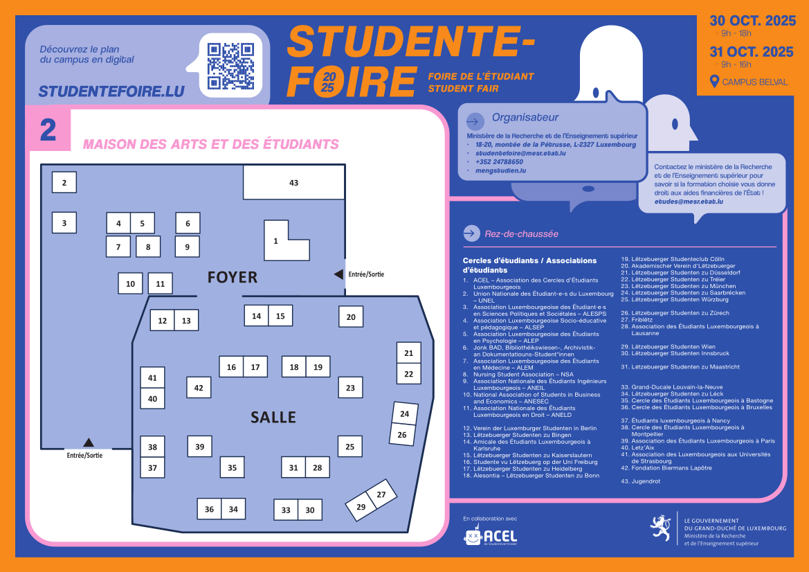 D’ACEL an hier Memberen si mat iwwer 40 Stänn an der Maison des Arts et des Étudiants um Rez-de-Chaussée ze fannen. Mir bidden d’Méiglechkeet sech mat Lëtzebuerger Student:innecerclen aus 6 Länner a 9 Fachberäicher auszetauschen.
