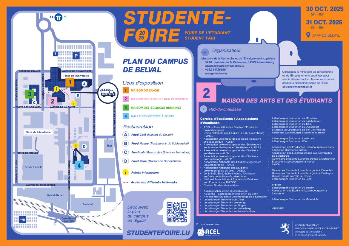 Op der Studentefoire informéiert d’ACEL zesummen mam Ministère fir Fuerschung an Héichschoul zanter bal 40 Joer iwwert de Studium, d’Universitéitsliewen an alles waat dozou gehéiert. Jiddereen ass wëllkomm, sech iwwert seng Zukunft ze informéieren!